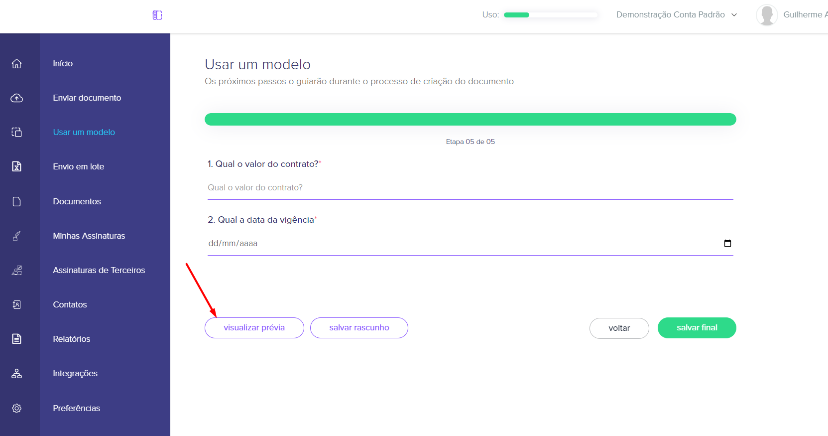 7. Em algumas ocasiões, o usuário que faz o preenchimento não tem todas as informações para finalizar o processo e enviar o documento para assinar. Por conta disso, é possível salvar o rascunho.