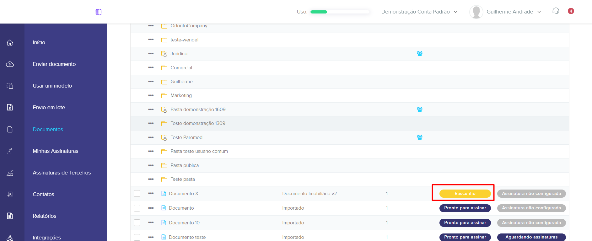 8. Ao salvar como rascunho, o documento será salvo com o Status Rascunho e você poderá entrar no documento a qualquer momento para terminar o preenchimento.