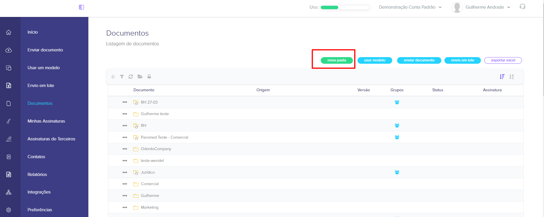 2. Clique no botão "Nova Pasta" e um modal será aberto para preenchimento do nome da pasta. Após escolher o nome, clique em salvar.