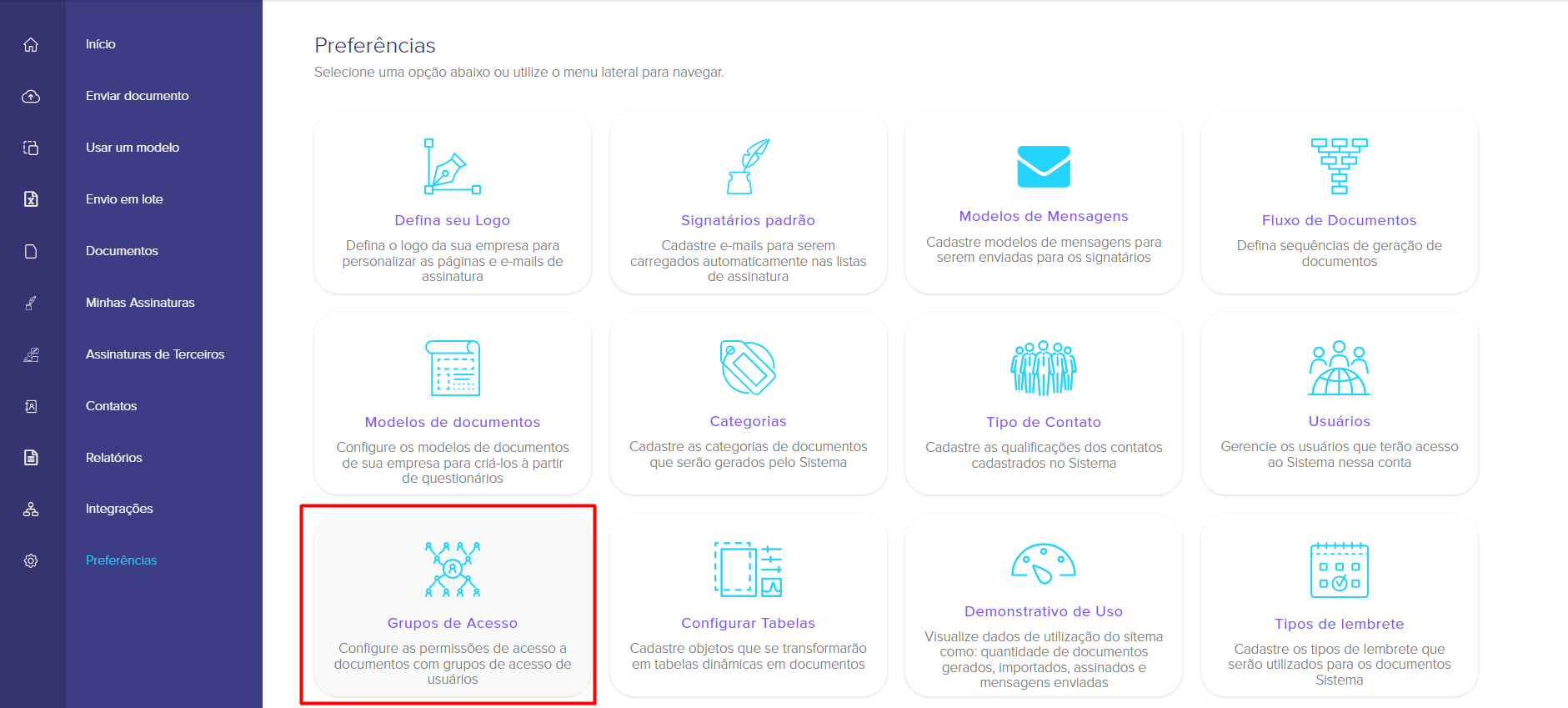 5. Caso não tenha nenhum grupo criado ou deseja adicionar outro, vá em 'Preferências' -> 'Grupo de acesso'.